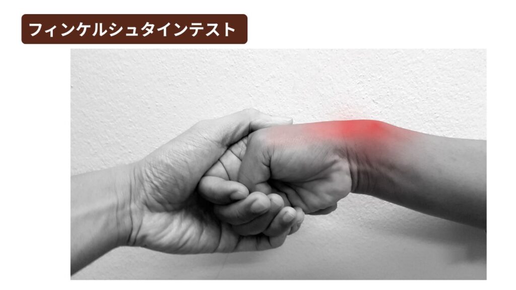 - 親指を内側にして手を握り、小指側に手首を曲げると、親指の付け根に強い痛みがある(フィンケルシュタインテスト)