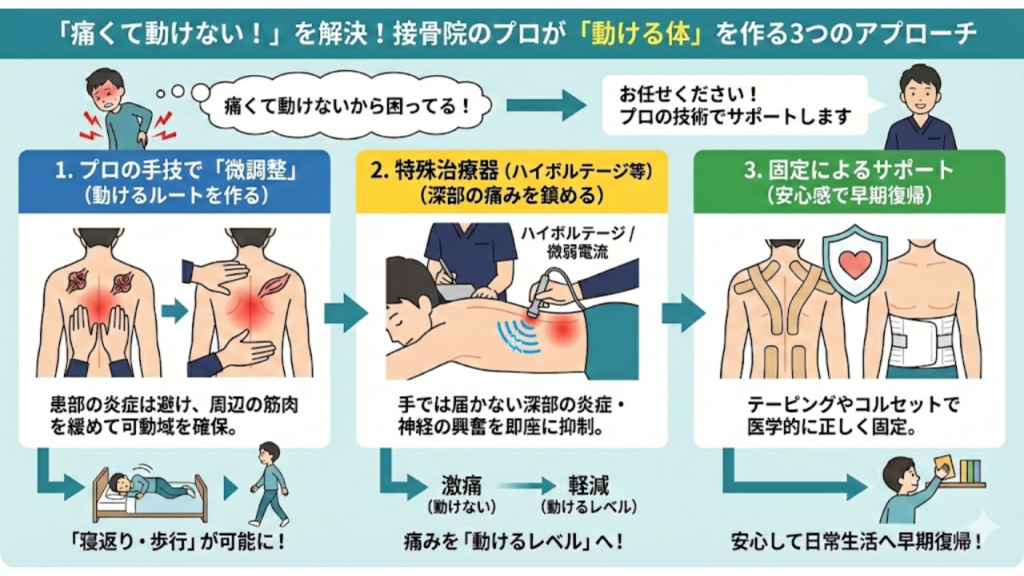 ここで、「動ける状態を作る」ために、接骨院(柔道整復師)のプロの技術が必要になるのです。