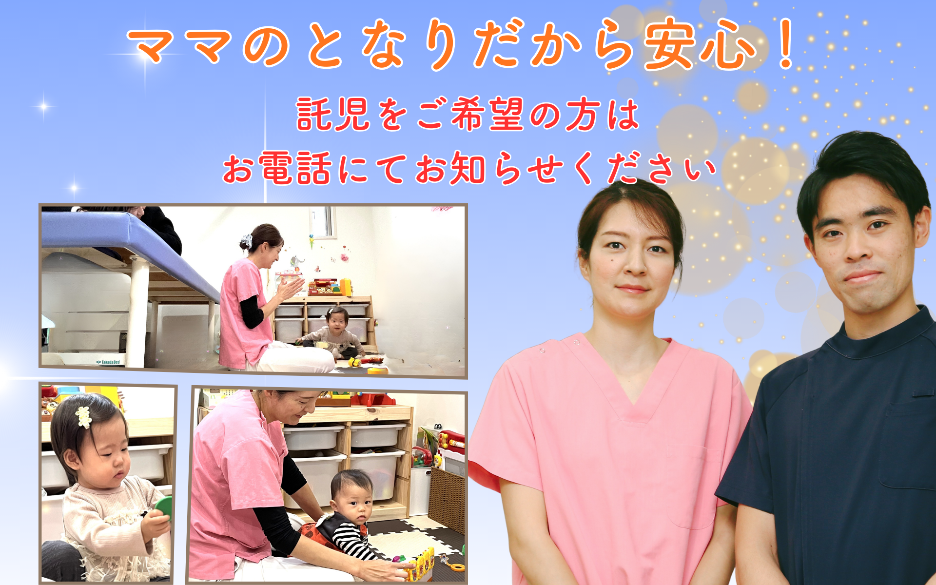 ※託児サービスについて :女性スタッフによる託児・見守りを行なっています。託児をご希望の方はお電話にてお知らせください。